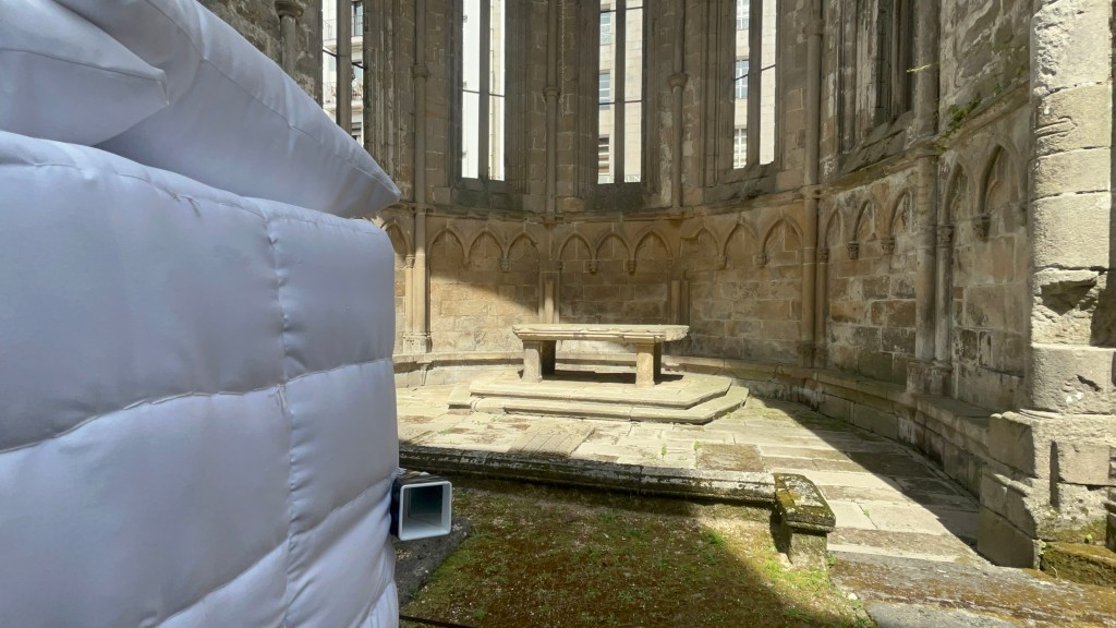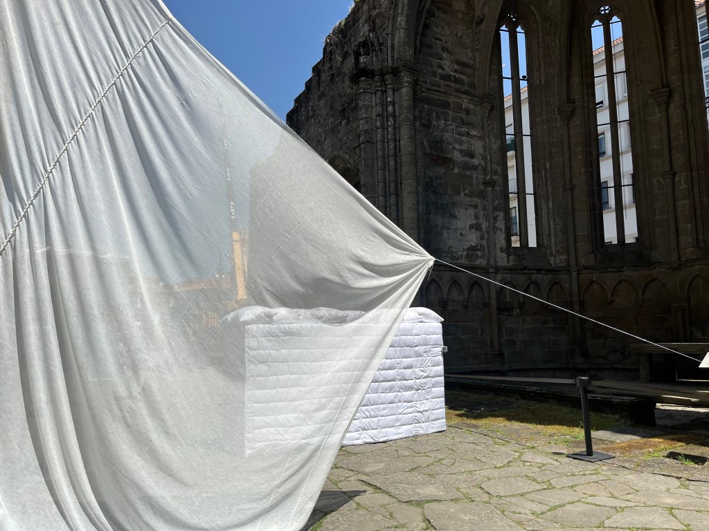 “In this installation located in the Ruins of San Domingos, Zehra Doğan reflects on the struggle to survive in times of violence. The piece focuses on the construction of a barricade, an action that, to the artist, goes beyond a mere physical defence. It stands as a symbol of resistance, of reaffirmation of freedom and the right to exist. The barricade emerges as a response to external aggression and as an act of solidarity, hope and renewal after destruction. In this work, Doğan invites us to question the fragility of human life in wartime and to recognise how everyday objects, deprived of their original function, can be transformed into elements of resistance.”