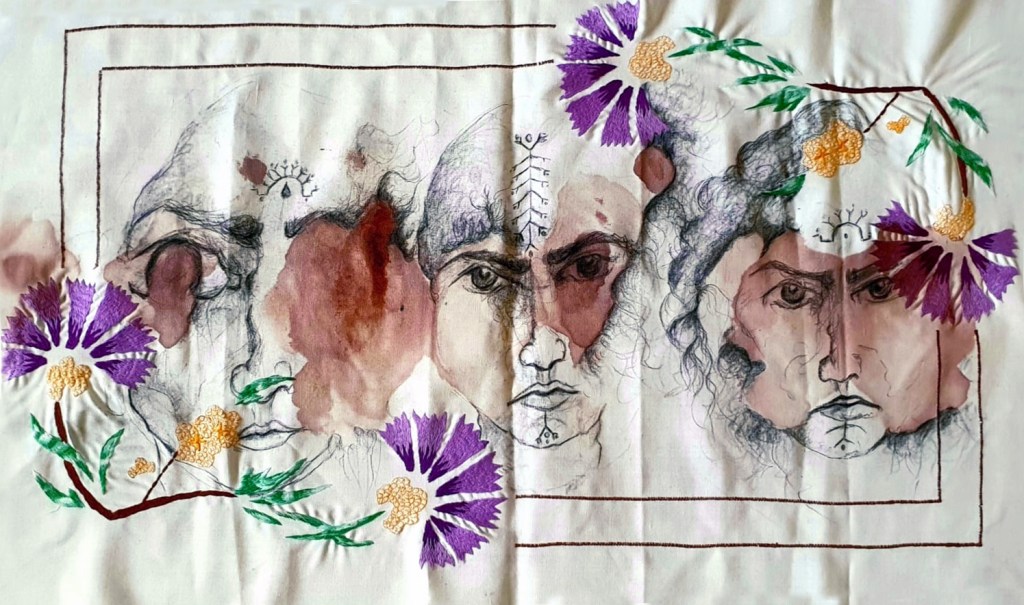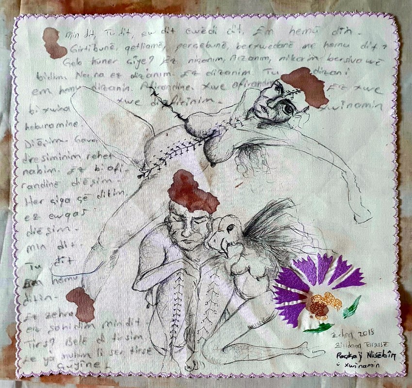 86 x 66 cm. Scarf, menstrual blood, ballpoint pen, hair. 2018 Diyarbakır prison.