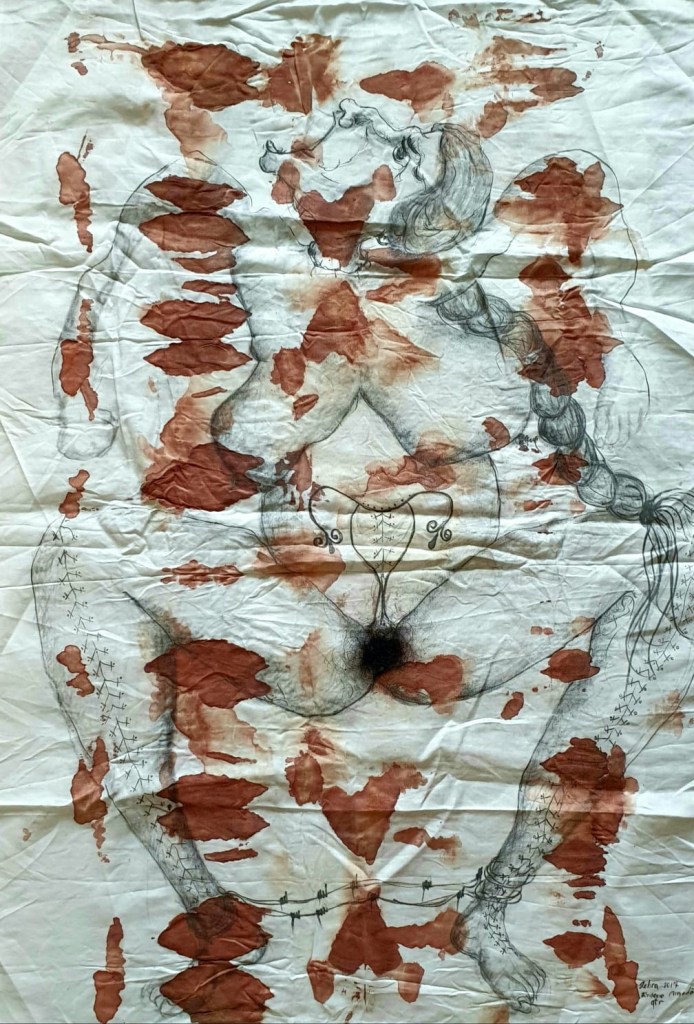 19 x 32 cm. On paper, menstrual blood, paper, pencil. 16.04.2018, Diyarbakır prison.