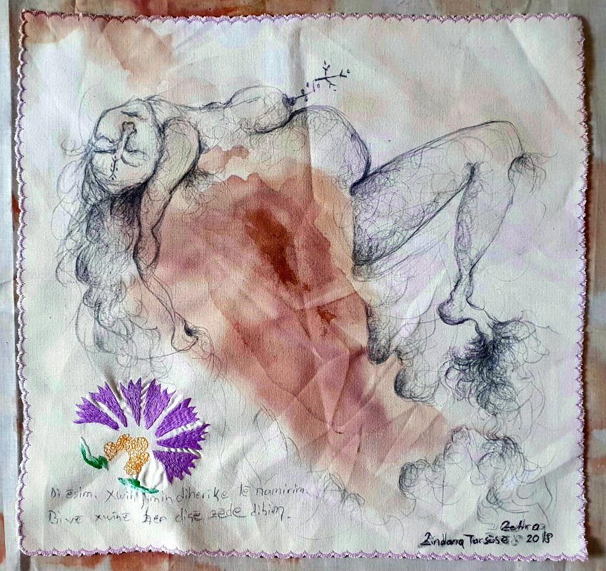 The guard half-opens the door and calls out “Let Zehra Doğan come, the chief guard wants to speak to her”. Asking myself “what crime have I committed this time? Which drawing did they find problematic again?” I walk out the door, with Meral the representative of our quarter. The chief guard was waiting in the hallway. He started speaking with a relatively polite attitude, saying “I don’t know how to say this…”, “don’t mind me, please excuse me, but apparently you are making drawings with blood, is this true?” He asked with patriarchal embarrassment. On his own, he was censoring the word “menstrual” and settling on the word “blood”.