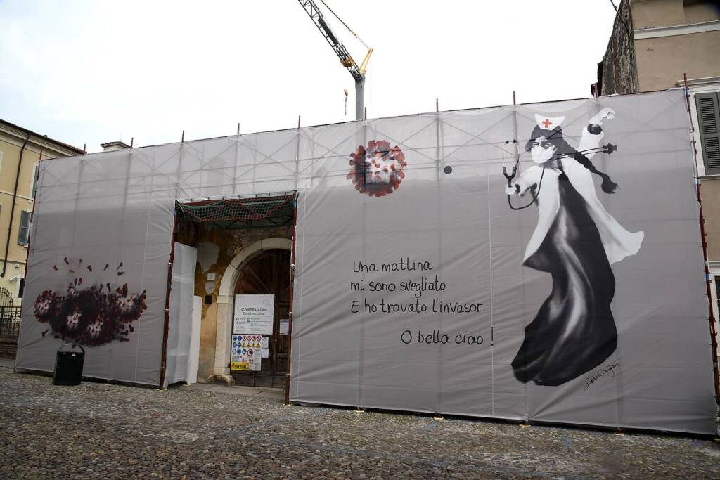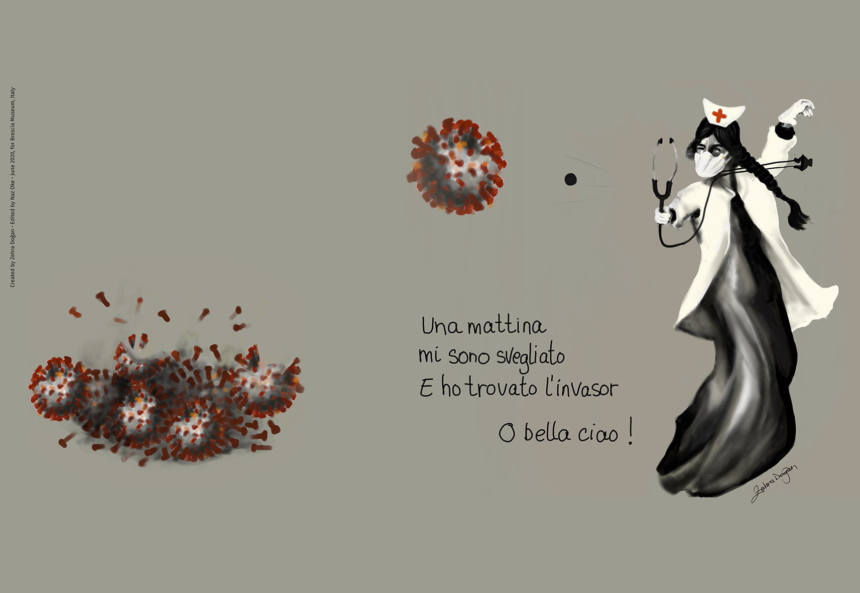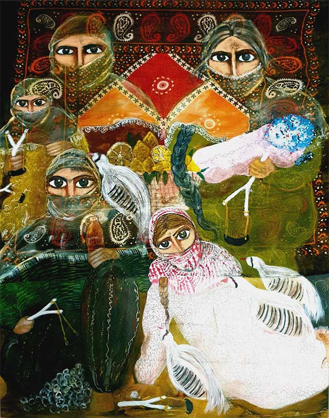 The slingshot is a recurring image in Zehra’s works. Women and children bearing slingshots, such as in the works titled “Protest Family”, “Hunting and Delivery” or yet again in the fresco exhibited in the streets of Brescia in Italy in 2020, honouring medical staff fighting against the pandemic.
