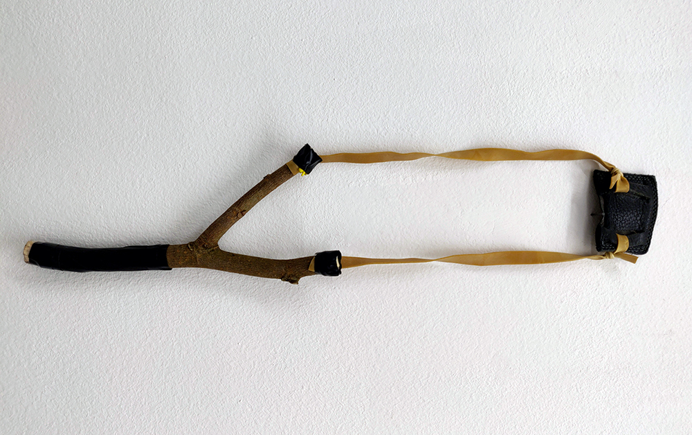 Respecting the tradition of those used by Kurdish children, these slingshots are made from tree branches – in this case, mulberry trees – as Zehra made them as a child, and of rudimentary stretches of elastic along with a piece of leather from old shoes.