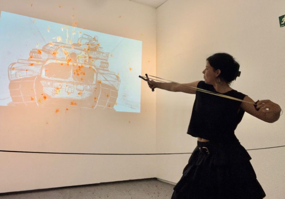 A white wall and an imposing, threatening armoured vehicle coming toward you. Slingshots are all you have at your disposal to protect yourself. The most singular and simple weapon. On this occasion, there are 4, representing the 4 parts of Kurdistan, split among Syria, Irak, Iran and Turkey.