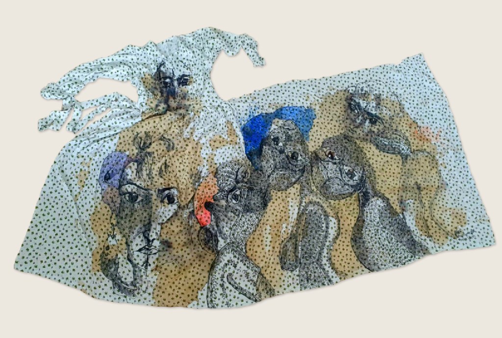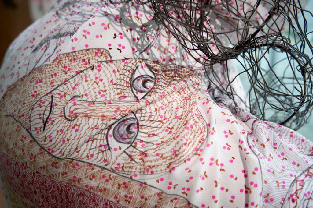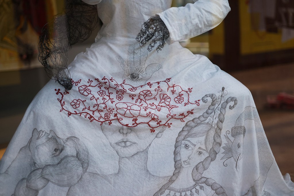 Dress with prison’s sheets, sleeves with ethnic shawl, tail collage, household linen (bundle), laces on the front, drawing with ball point. 2016, Mardin Prison