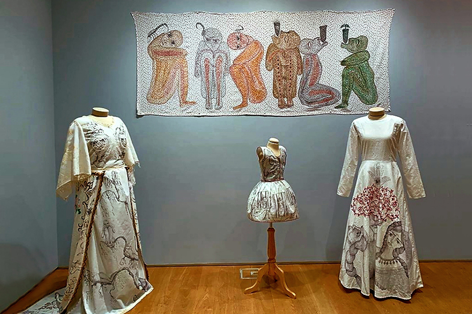 Dress sewn with prison sheets, embroidered with threads obtained by unknitting a sweater, ballpoint pen. February 2019, Tarsus prison