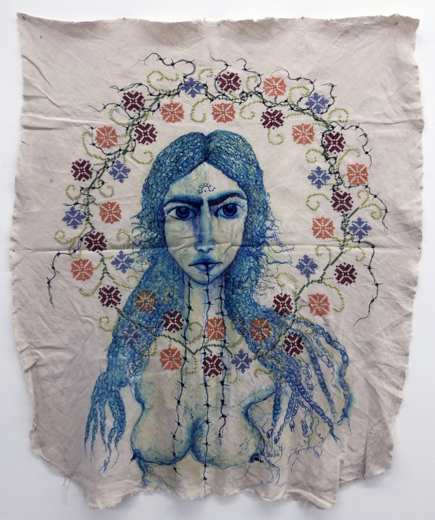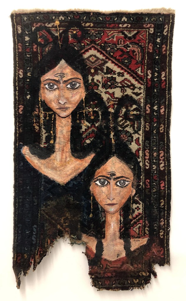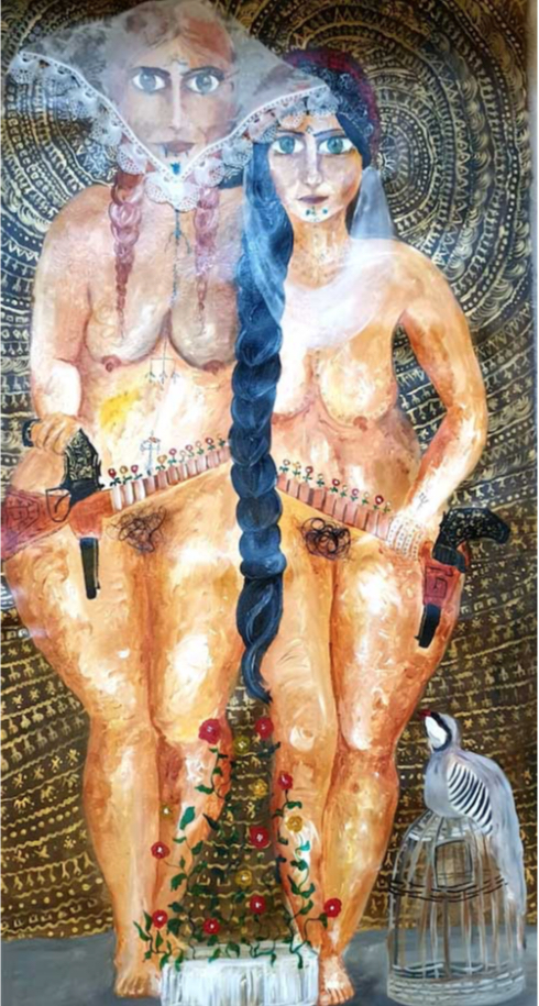 Keç û dê (Mother and daughter), 2019. Acrylic, cheescloth, hair on canvas, 149×78 cm. Prometeo Gallery, Milano.
