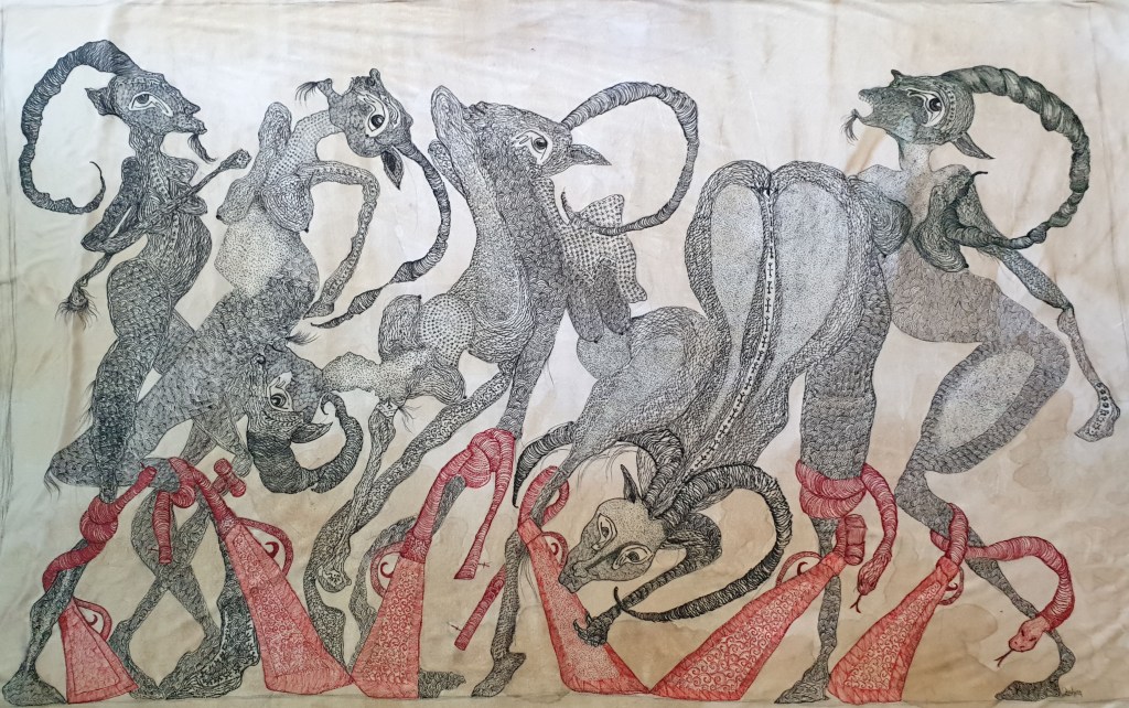 Ishtar, 2019. Oil painting, pastel, pomegranate juice on canvas, 150×100 cm. Prometeo Gallery, Milano.