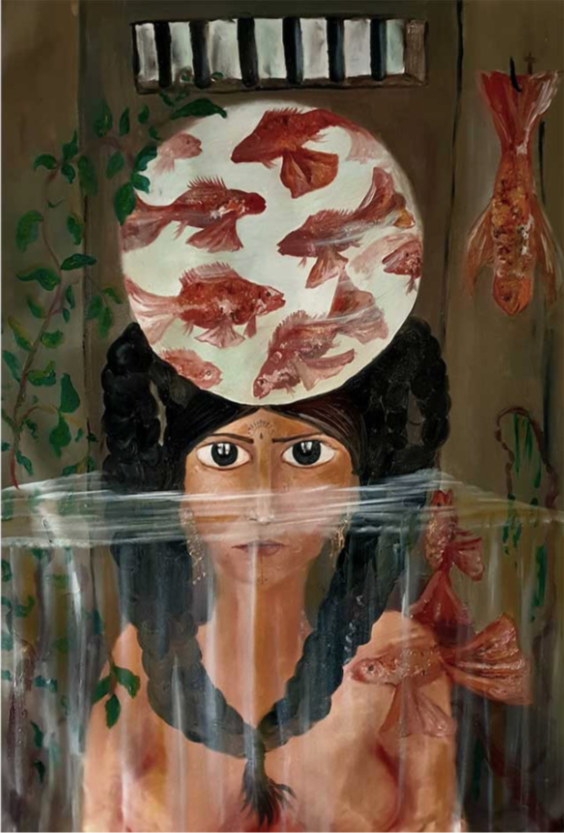 Balık kadın (Fish woman), 2019. Oil painting, collage fabric on canvas, 100×78 cm. Prometeo Gallery, Milano.
