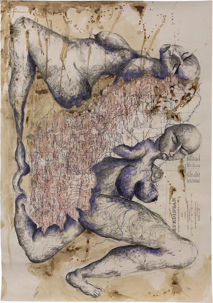 Kurdistan 1, 2020. On map, coffee, ball point pen, 150 x 107 cm. Ph. Ludovica Magnini. Prometeo Gallery, Milano.