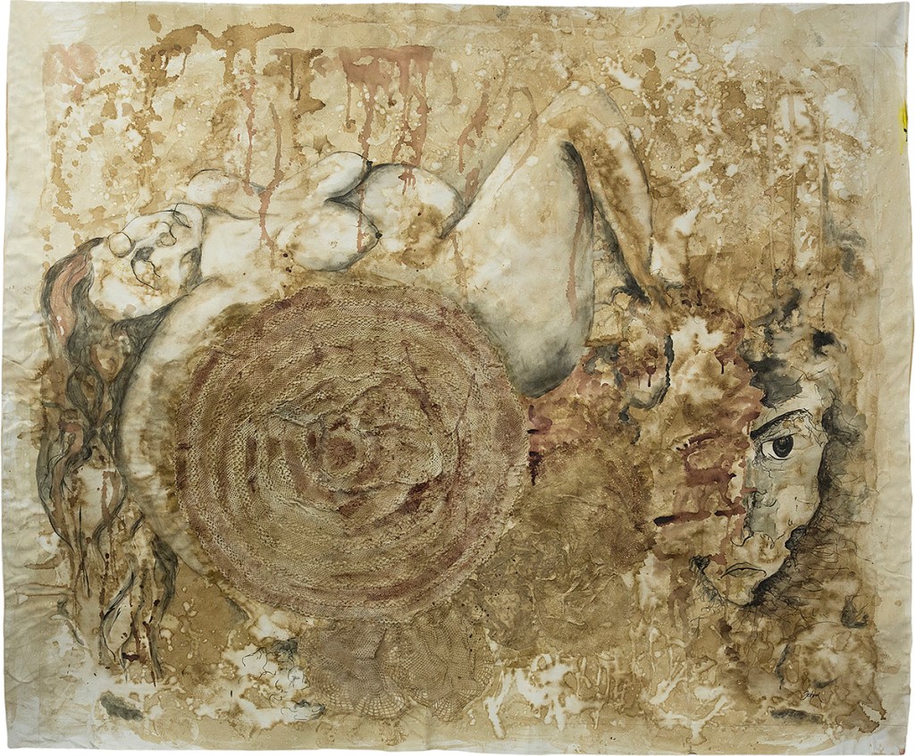 Spiral Cycle, 2020. Laces, coffee, menstrual blood, detergent, acrylic, 165 x 196 cm. Ph. Ludovica Mangini. Prometeo Gallery, Milano.