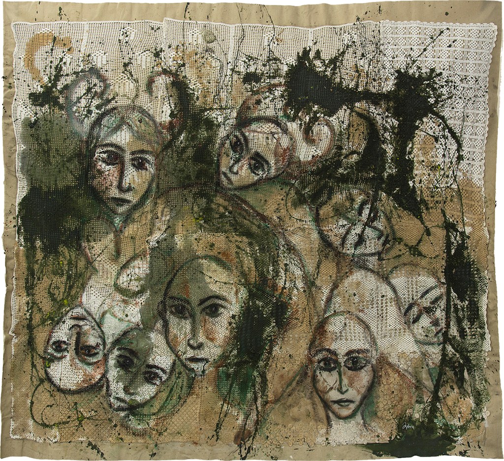 Protest Family, 2019. Acrylic, shawl, pearls on canvas, 135×107 cm. Prometeo Gallery, Milano.
