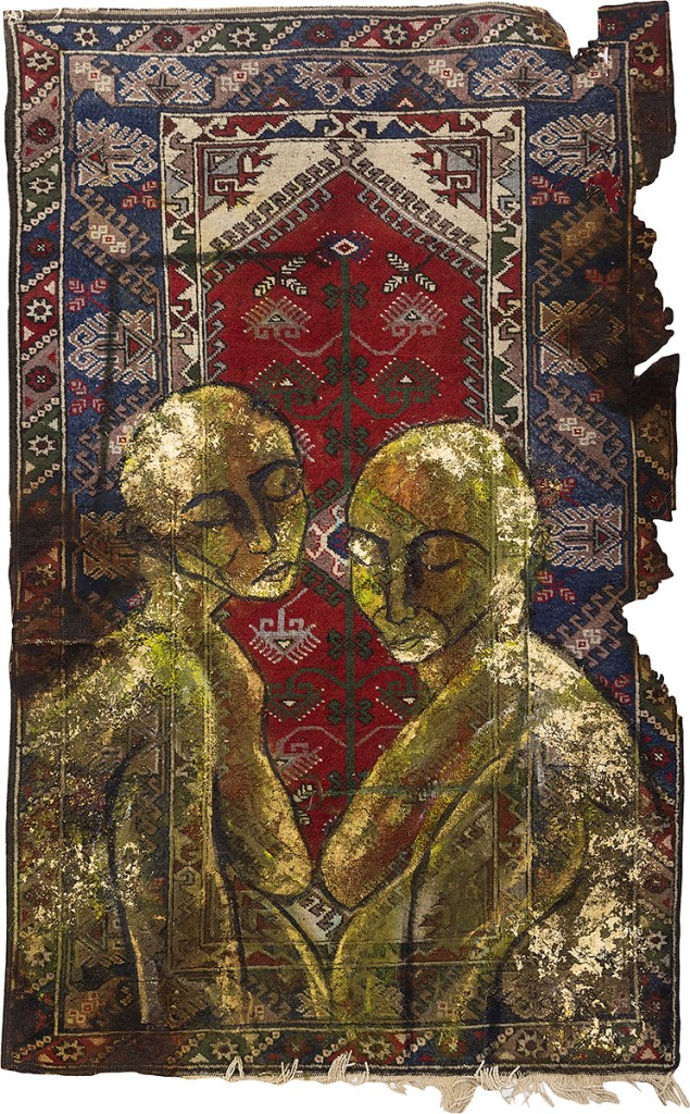 Yekbûn (Unity), 2020. On carpet, acrylic, gold paper, 126 x 200 cm. Ph. Mangini. Prometeo Gallery, Milano.