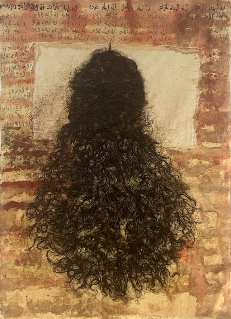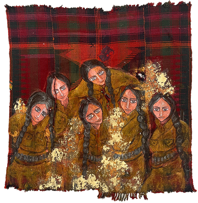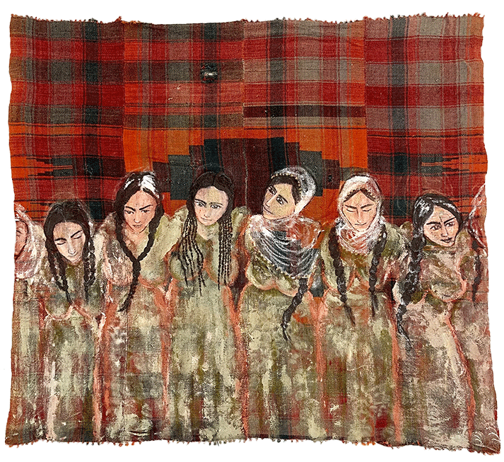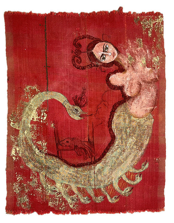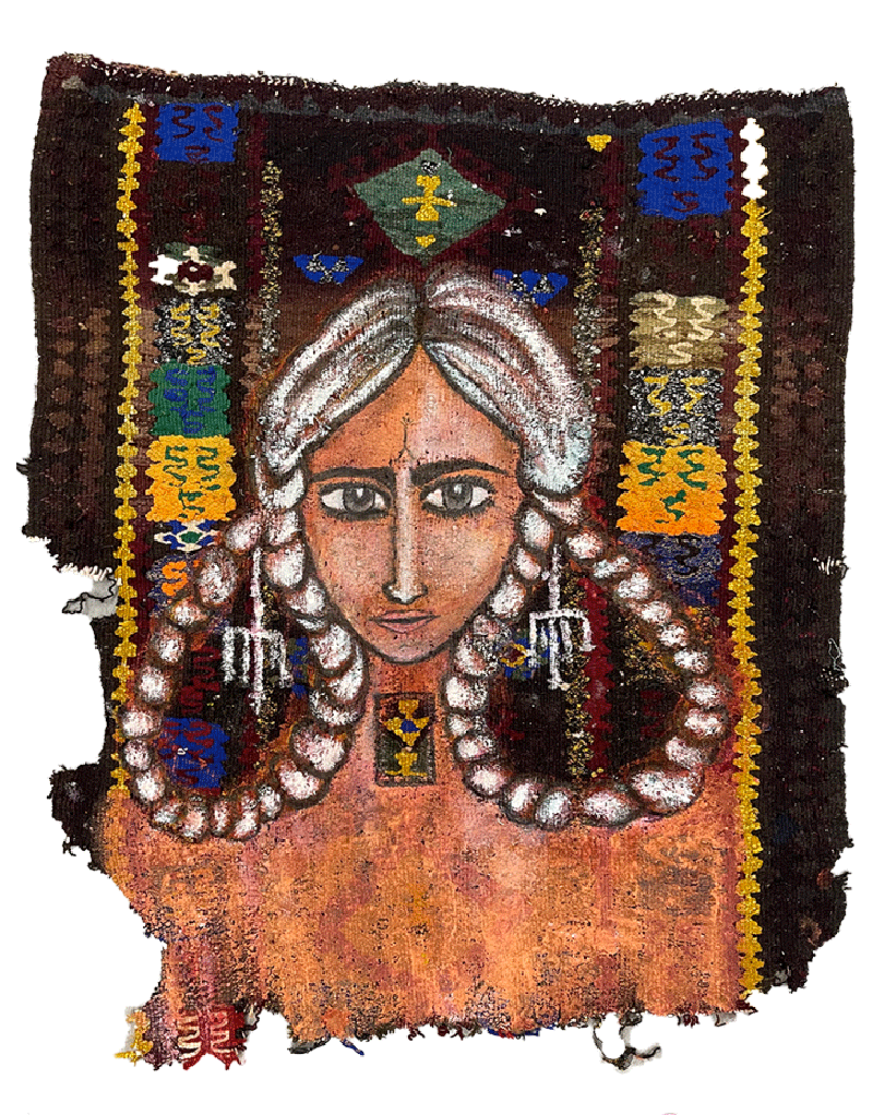 Sara Kaya. On canvas, mixed media on carpet, 90×68 cm. Lucca, Italy. Prometeo Gallery. (photo by Ludovica Mangini)