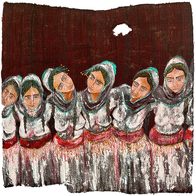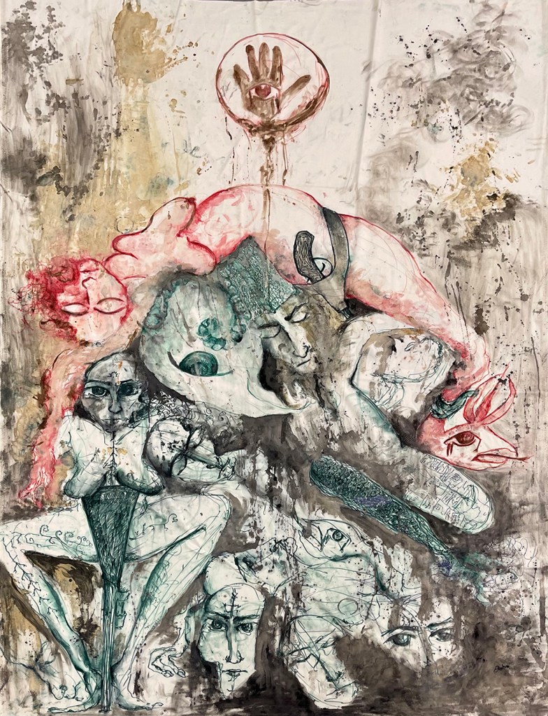 Givika bi Gek, 2022, Mixed media on fabric, 132h x 116w cm. Prometeo Gallery, Milano