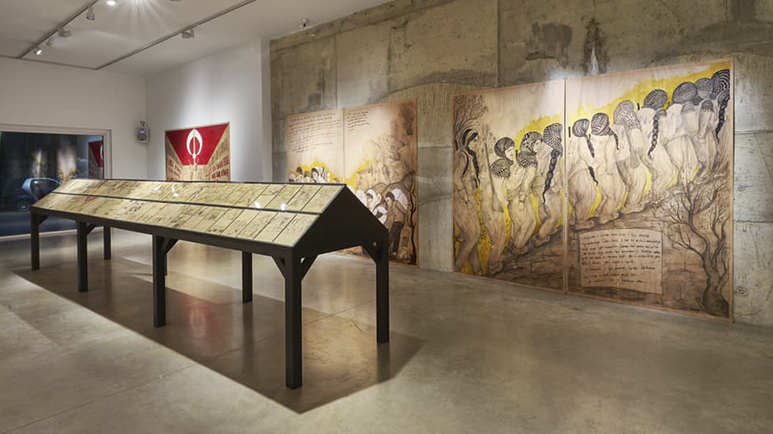 Nerinên bi neqş (Embroidered gaze). On carpet, mixed media on carpet. Lucca, Italy. Prometeo Gallery. (photo by Ludovica Mangini)