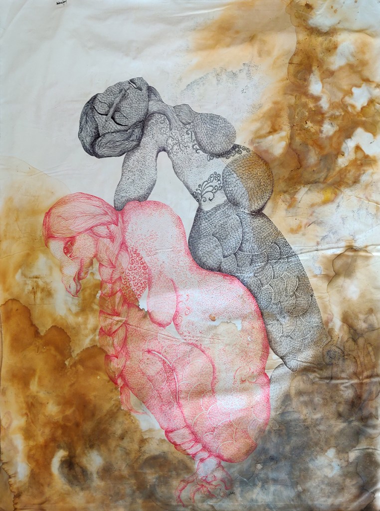 An angel descends on Babel. 2021, menstrual blood, pomegranate peel, organic paint, ballpoint pen, on fabric 155×128 cm.