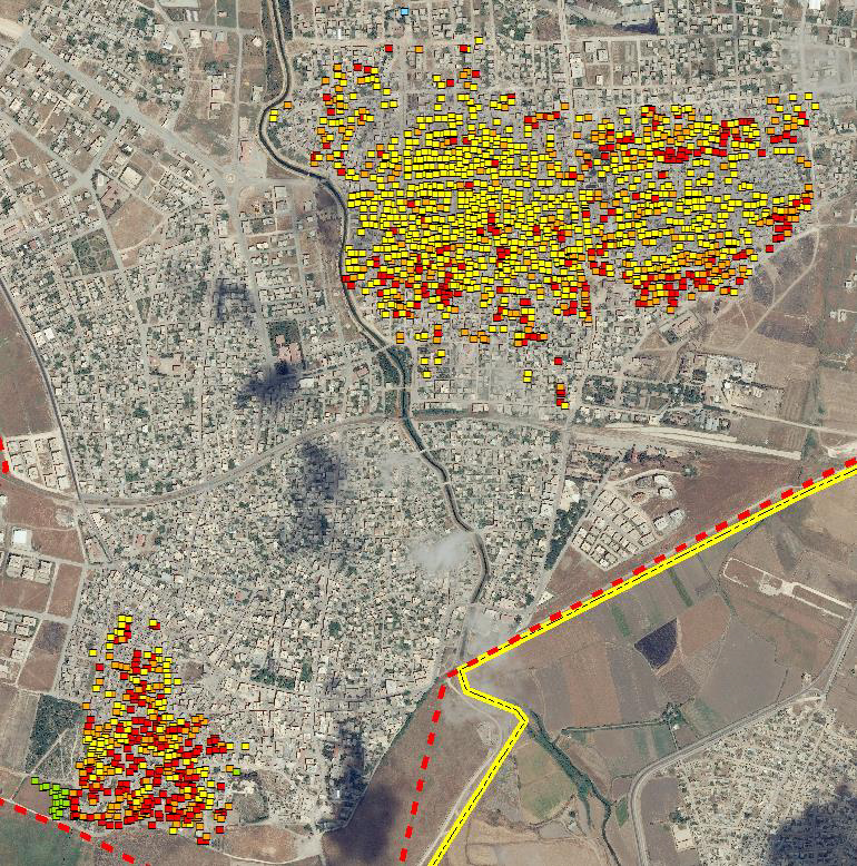 Red: distroyed. Orange :severe damage. Yellow: moderate damage. Green: impacts.